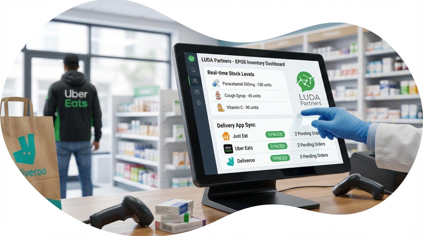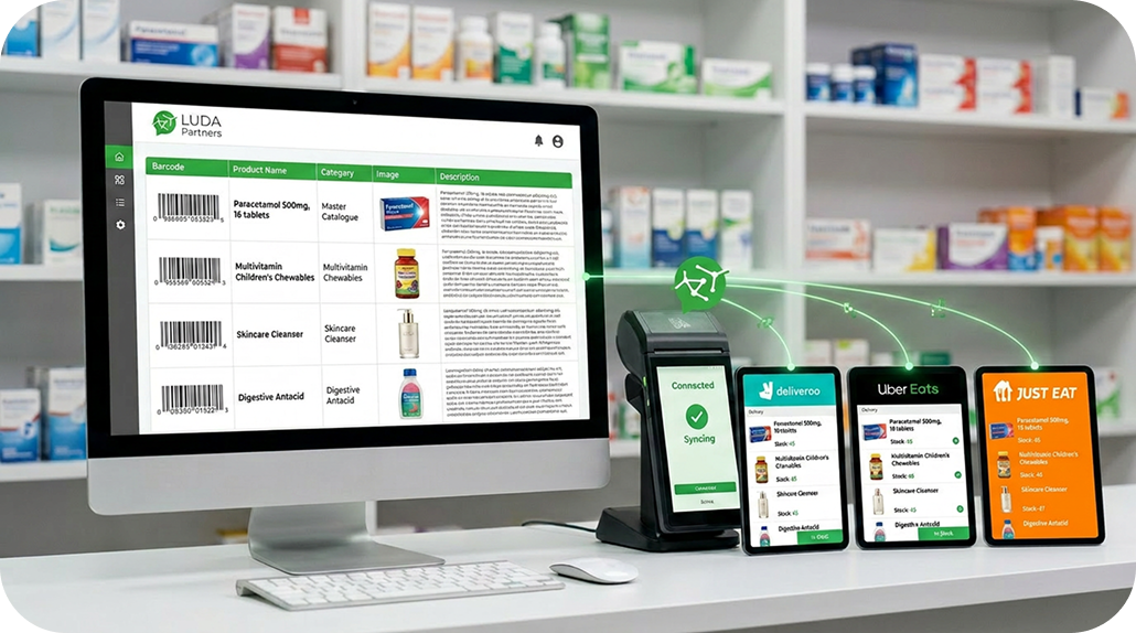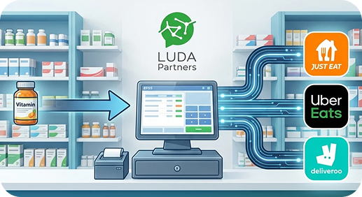 A customer buys vitamins in your pharmacy → Your EPOS updates the quantity → LUDA instantly syncs that change to all delivery apps.